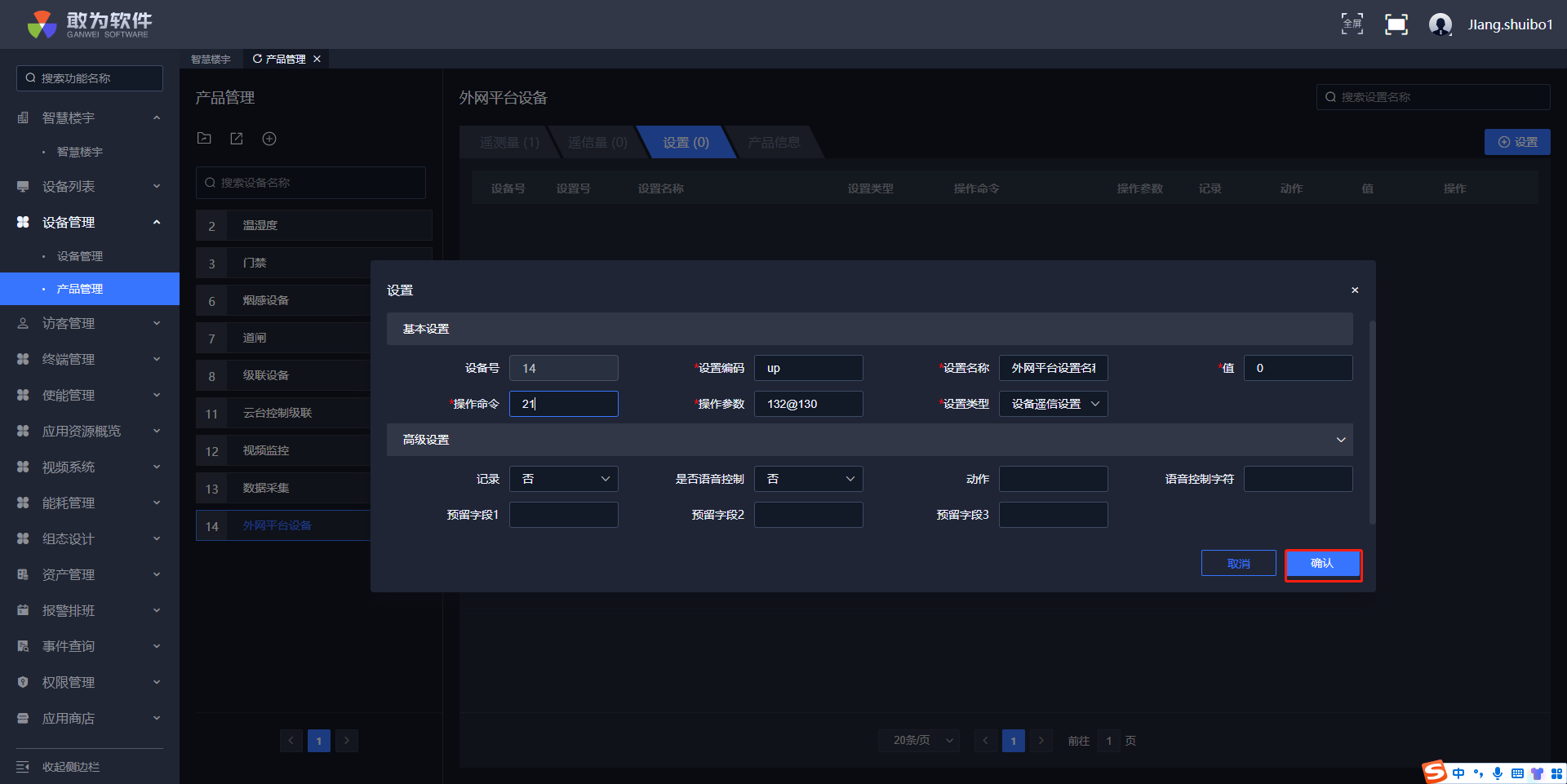 操作参数: 填入外网平台设备对应设置的操作命令。