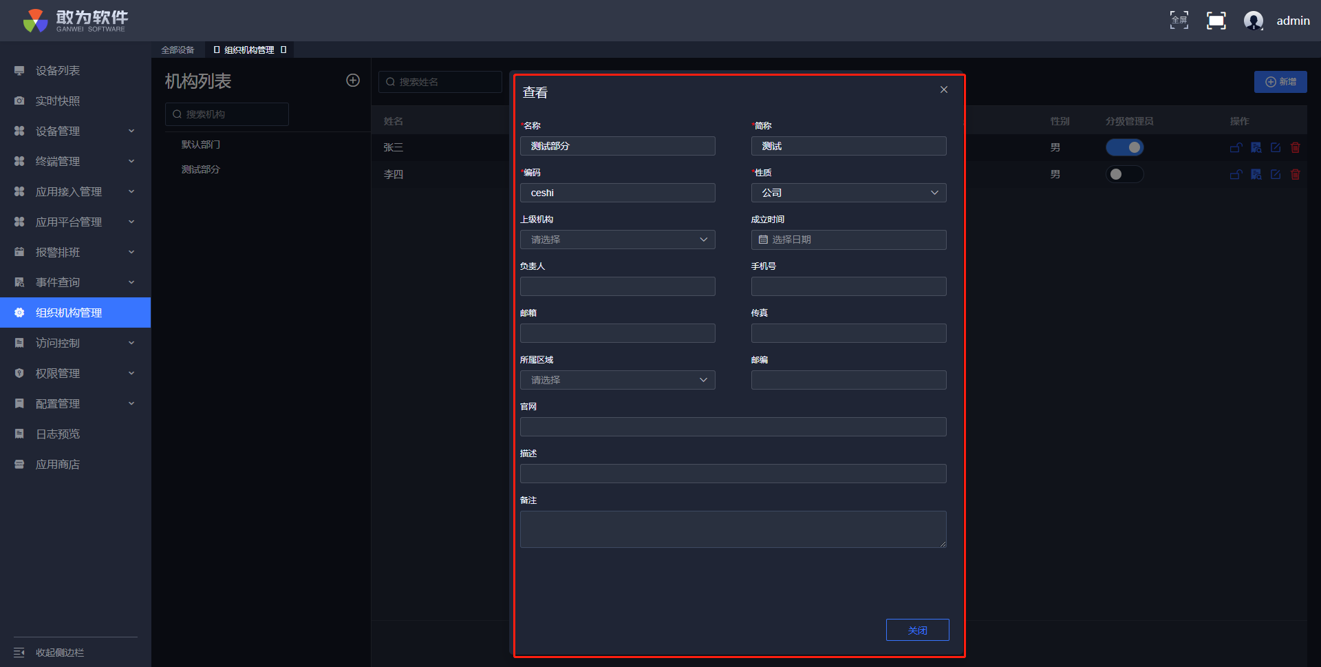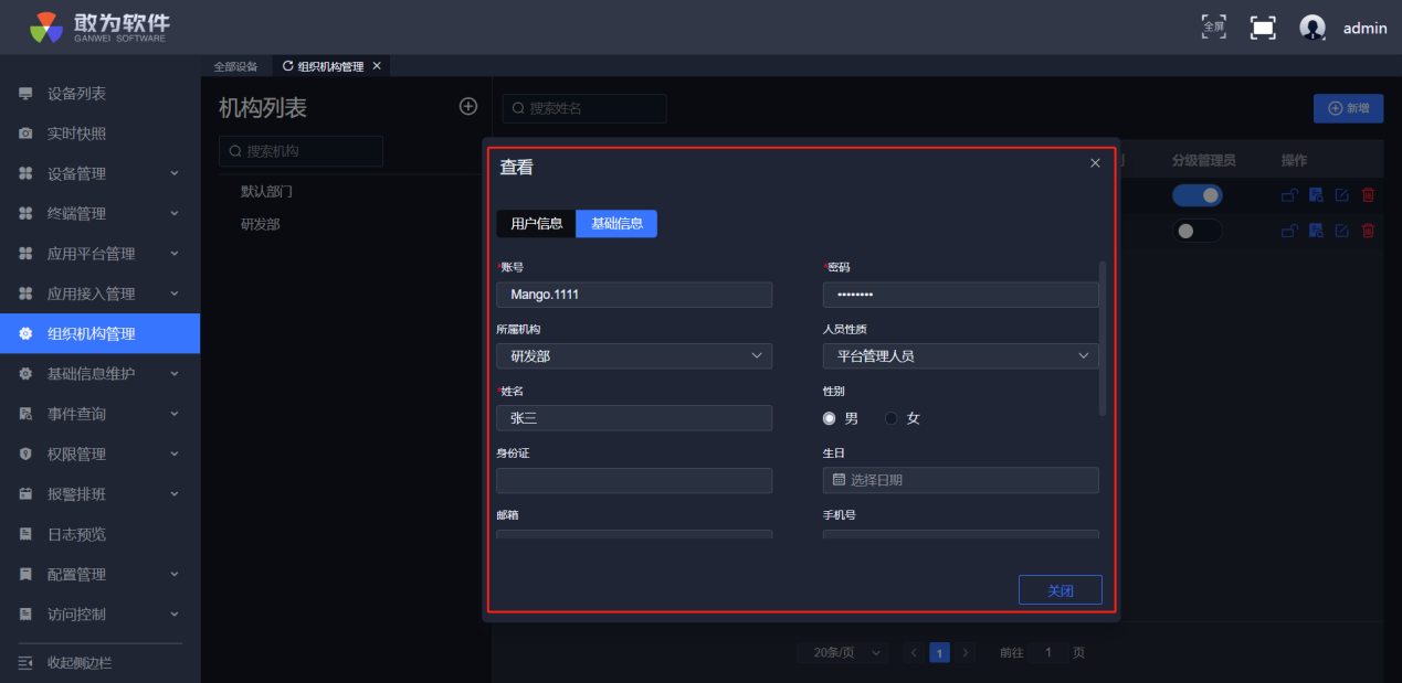 | 2 | 支持查看人员信息 | 1、管理员可以查看任意人员信息 2、分级管理员只能查看所属机构以及下属机构中的人员信息。 3、普通用户只能查看个人信息 |