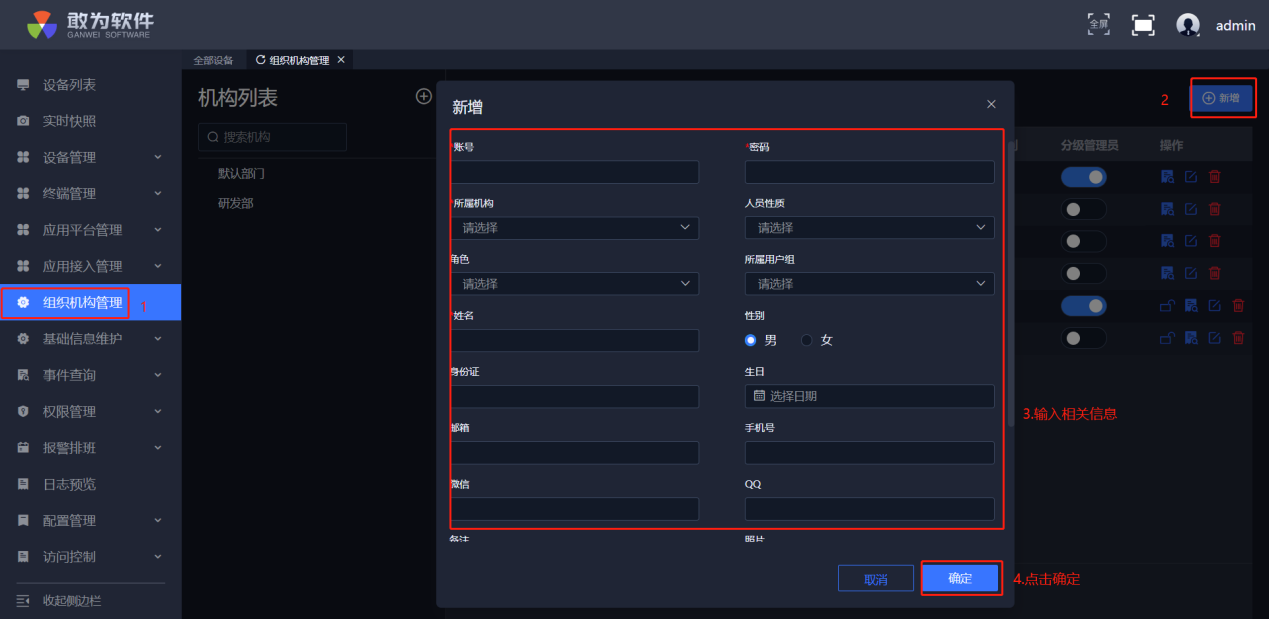 管理员可以新增任何机构人员信息;分级管理员只能新增所属机构以及下属机构人员信息;普通用户不能新增人员信息。