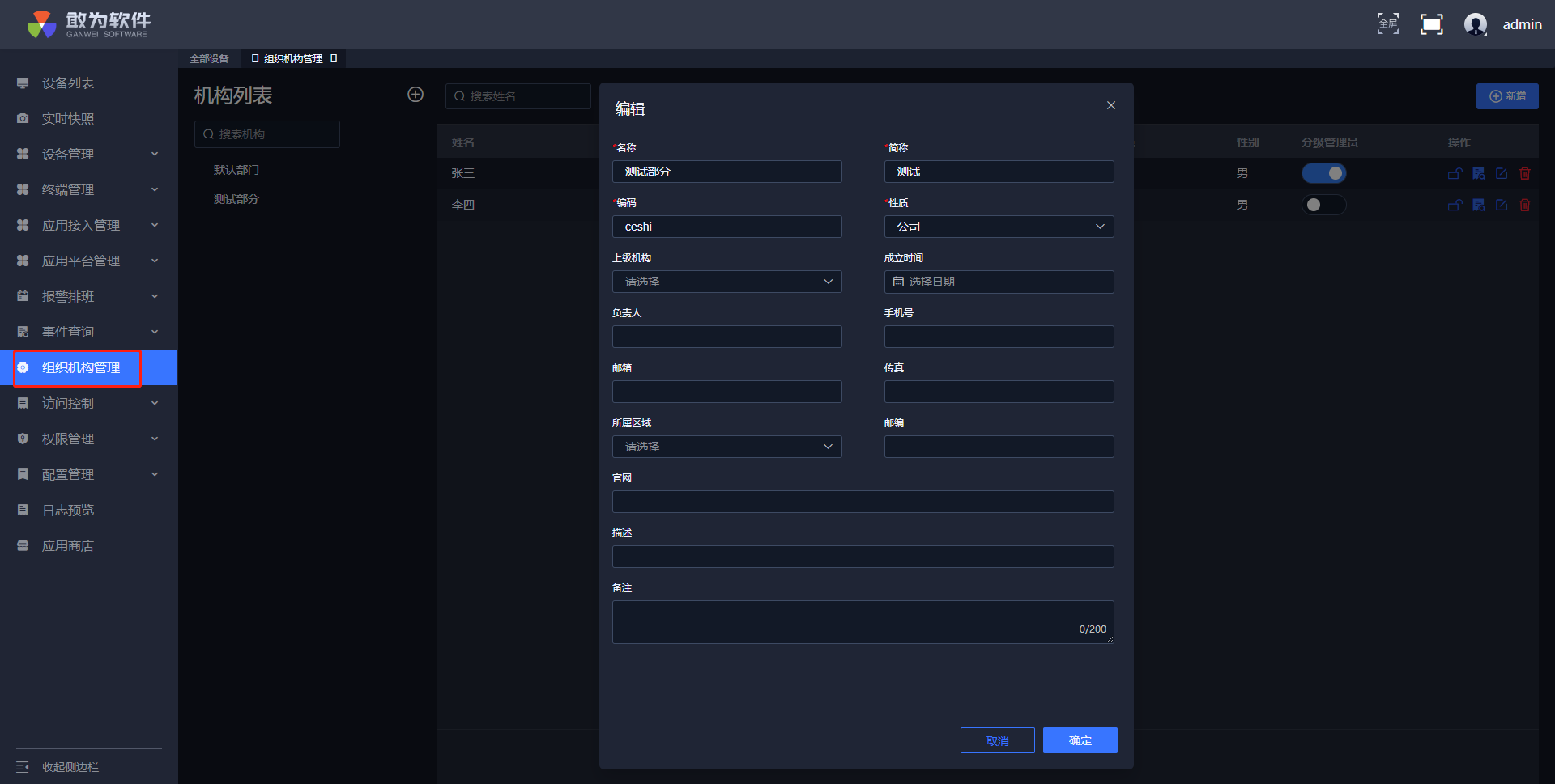 组织机构管理包含机构管理、人员管理两部分内容。组织机构管理将人员角色分为三类:管理员、分级管理员、普通用户。 管理员:管理员拥有所有的操作权限。 分级管理员:分级管理员在所属机构中具有唯一性;分级管理员拥有当前机构以及下属机构人员的操作权限。分级管理员只拥有所属机构以及下属机构的查看权限,不具备新增、编辑和修改的权限。 普通用户:只拥有个人信息的操作权限。