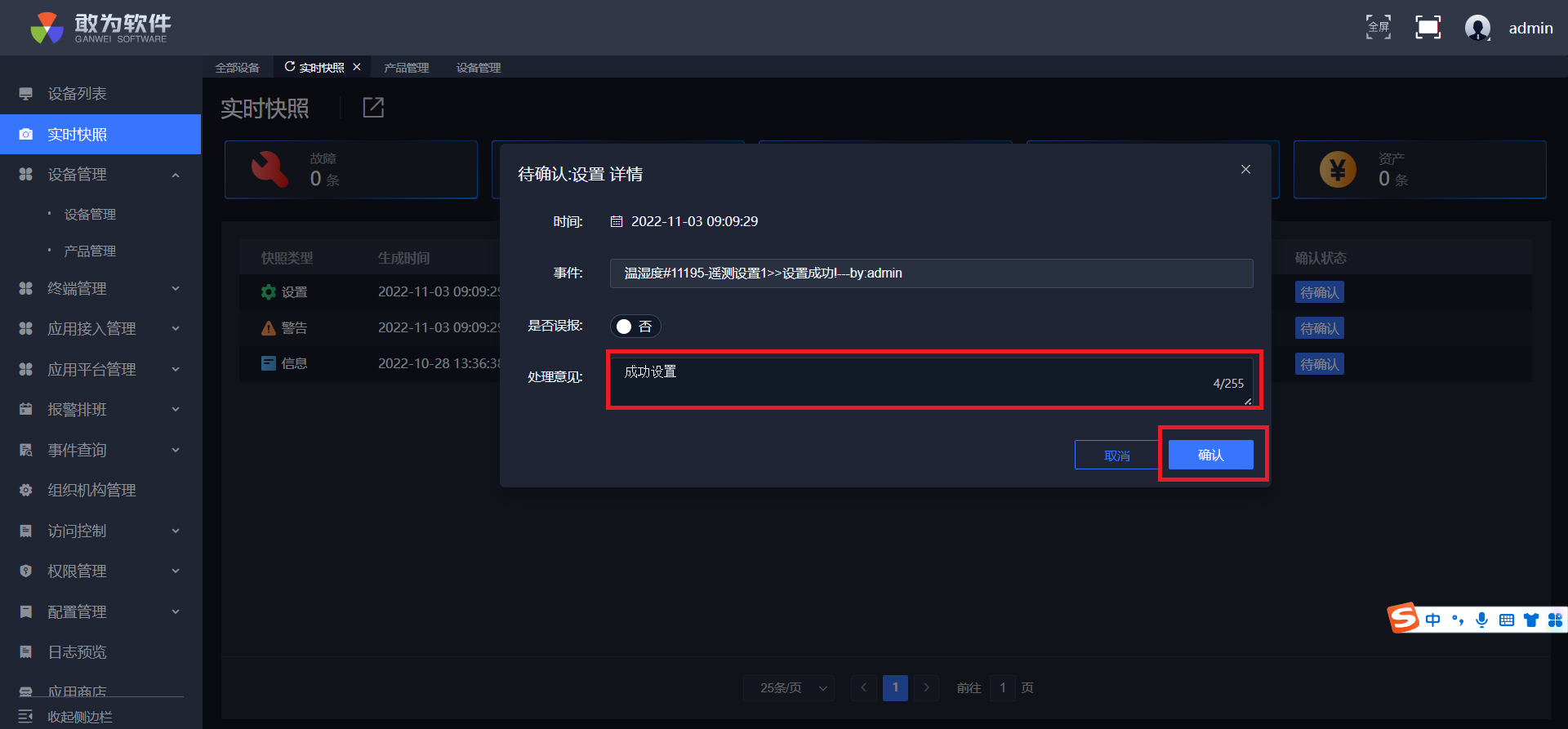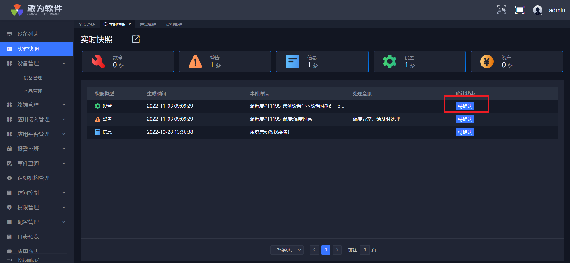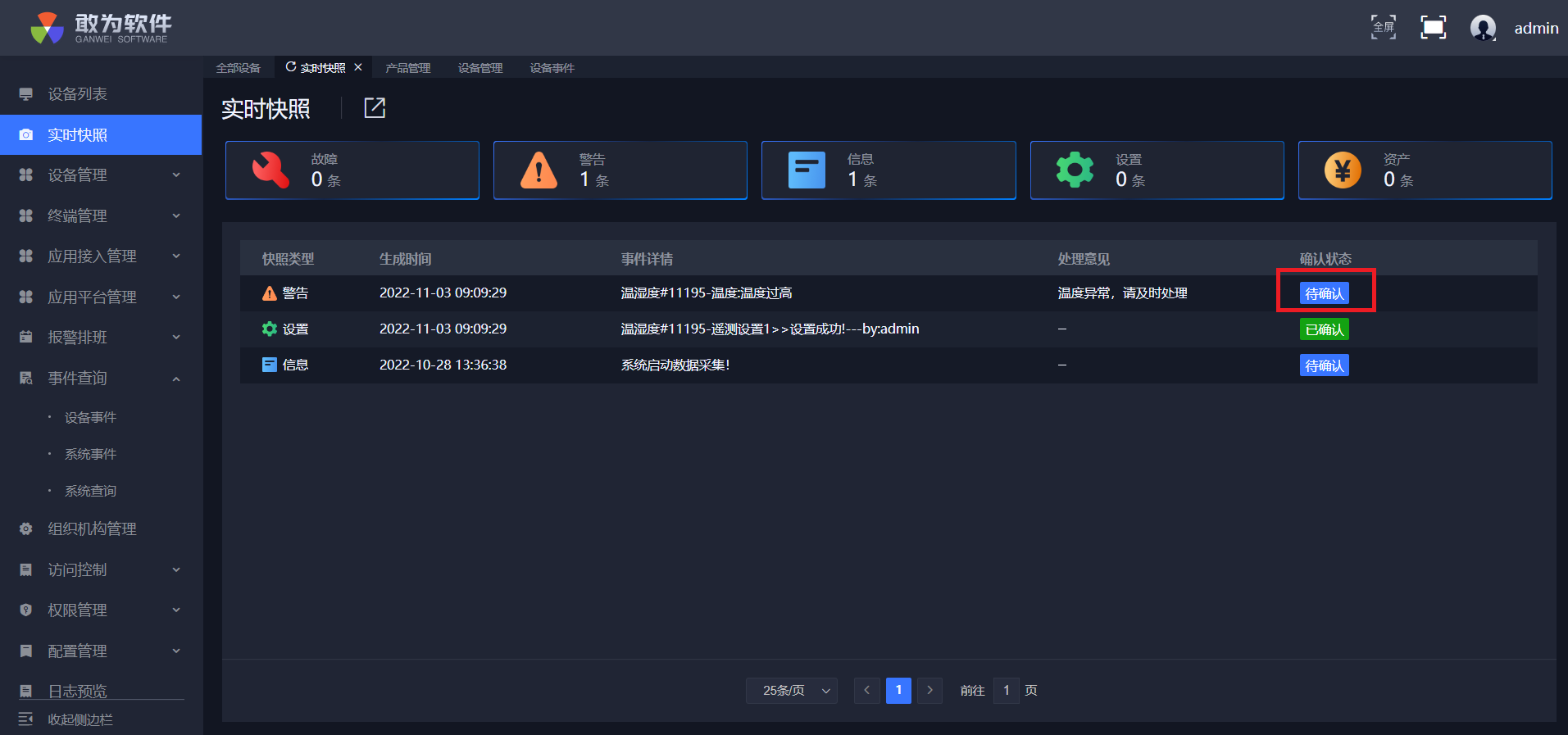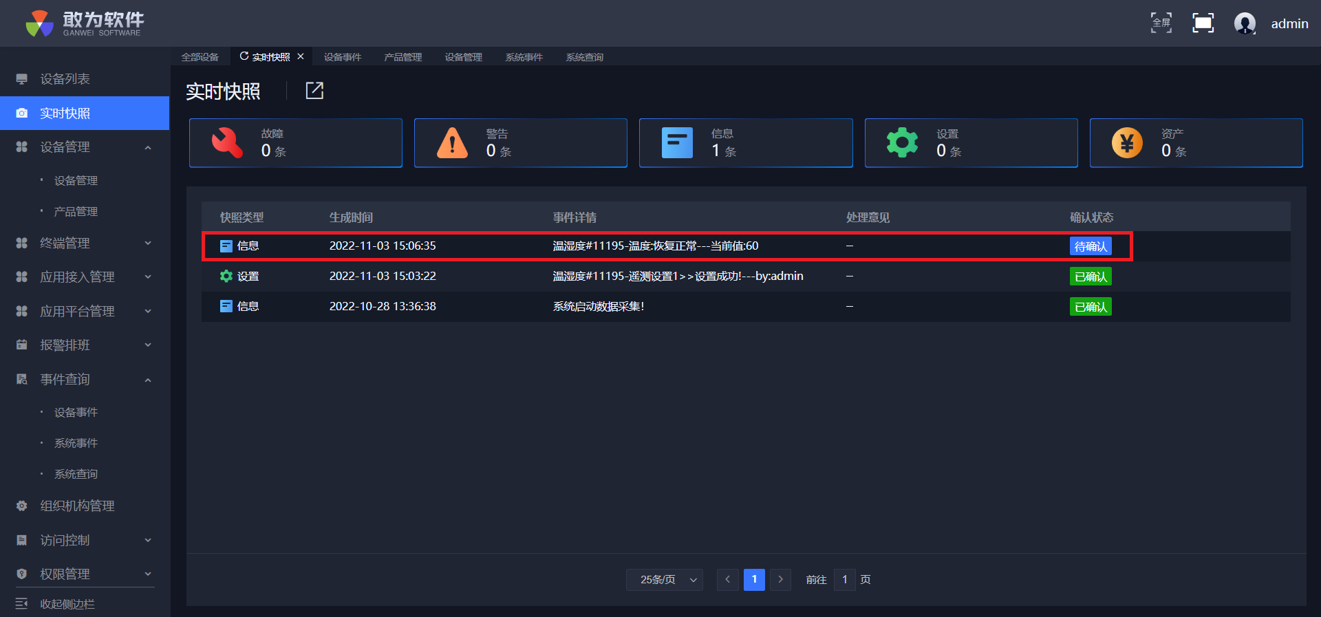 点击确认,实时快照中警告少一条,信息多一条,设备列表测点变成绿点,并且可在事件查询中查询到确认信息。