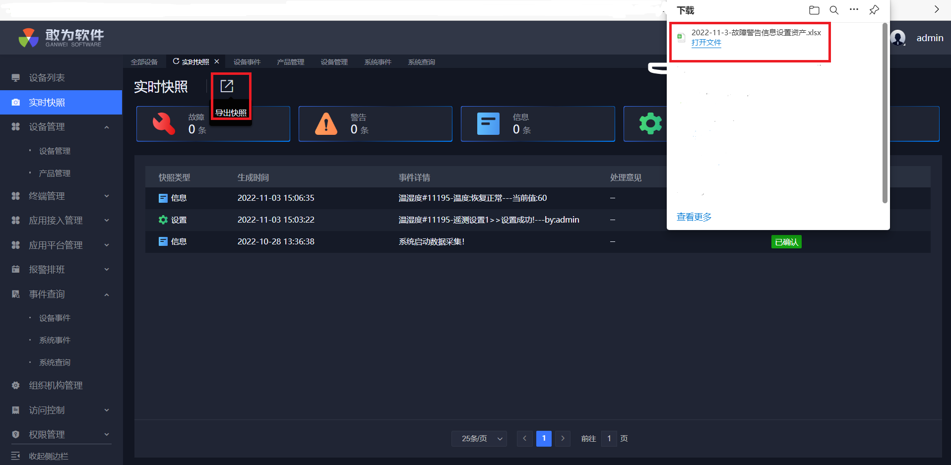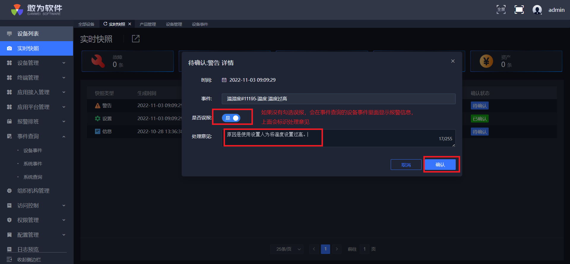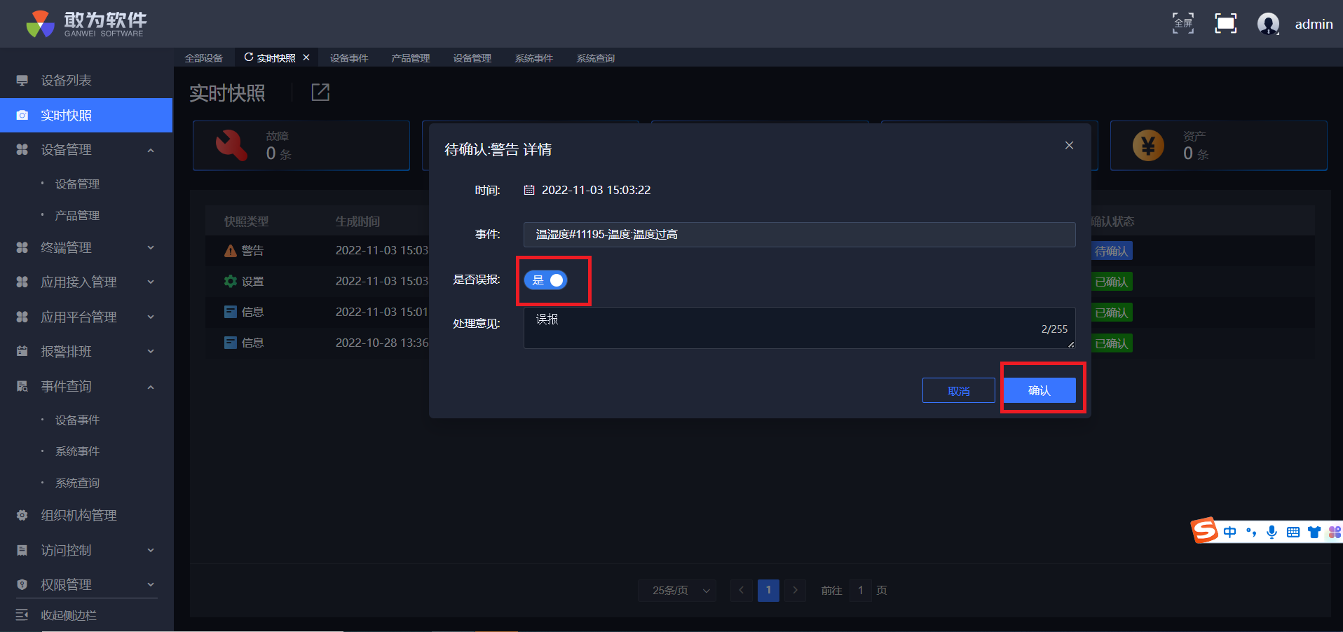 点击确认,实时快照中警告少一条,信息多一条,设备列表测点变成绿点,并且可在事件查询中查询到确认信息。