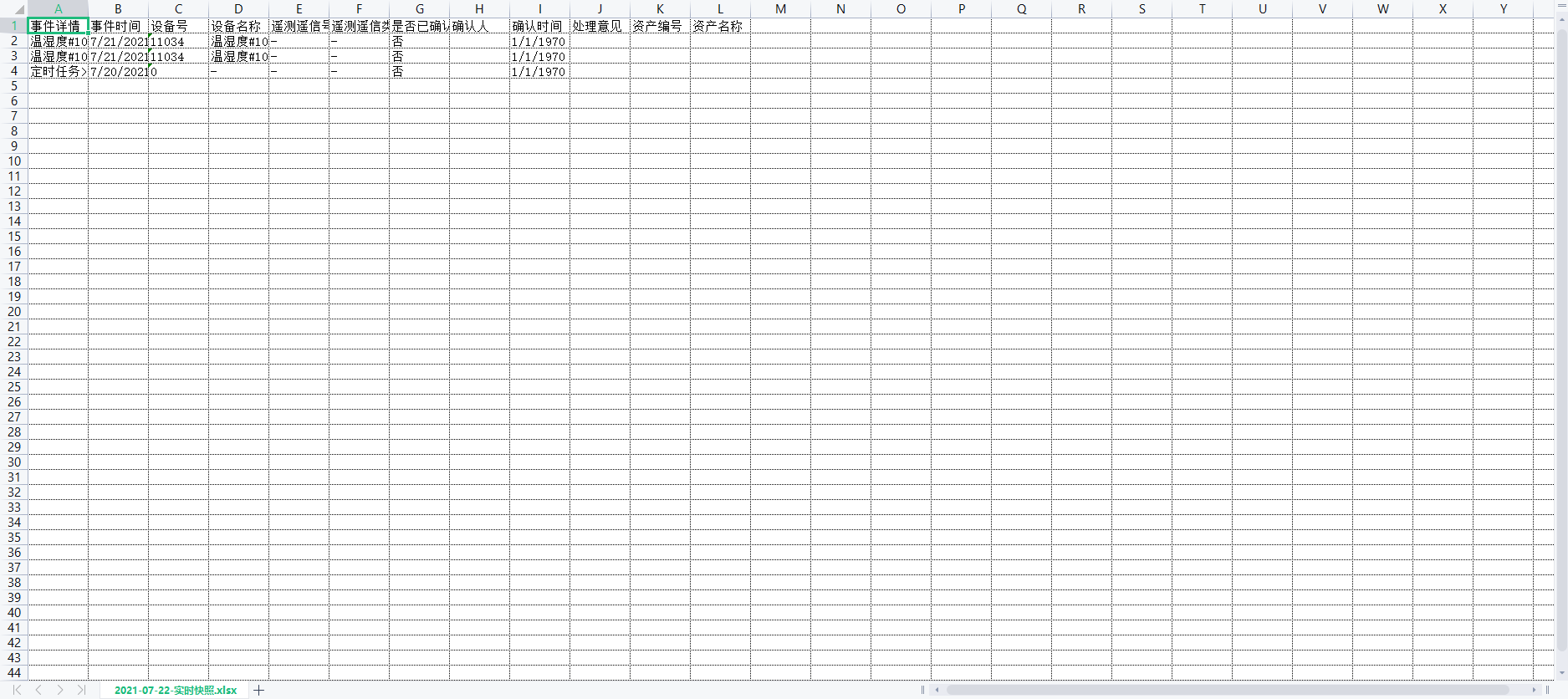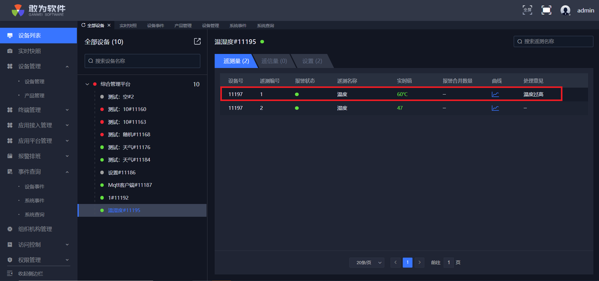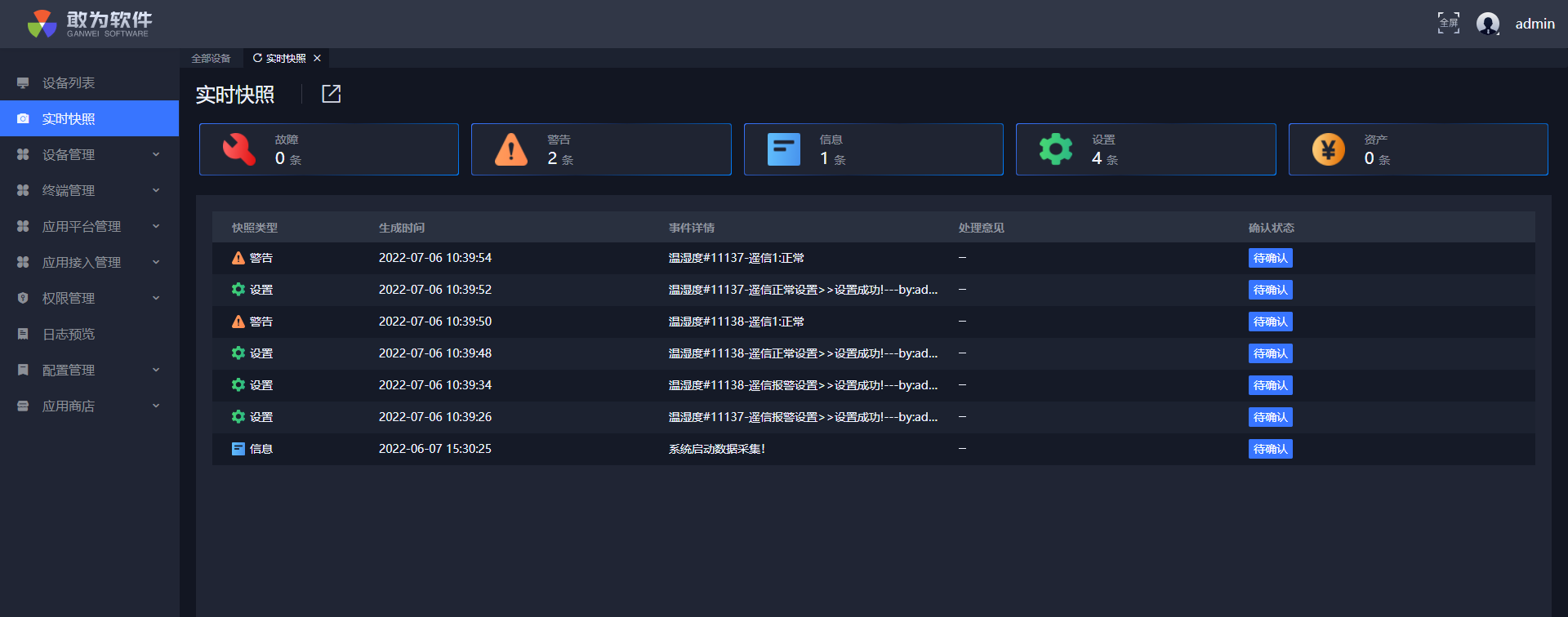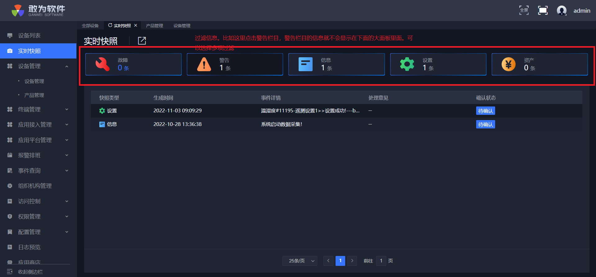 点击确认,实时快照中警告少一条,信息多一条,设备列表测点变成绿点,并且可在事件查询中查询到确认信息。