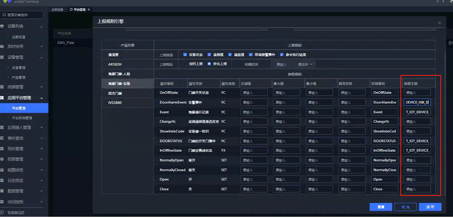 在进行数据变化上报时默认使用的Kafka主题为【T_IO_DEVICE_DATACHANGED】,如果需自定义主题分发,可通过应用平台管理=》上报规则管理进行配置。