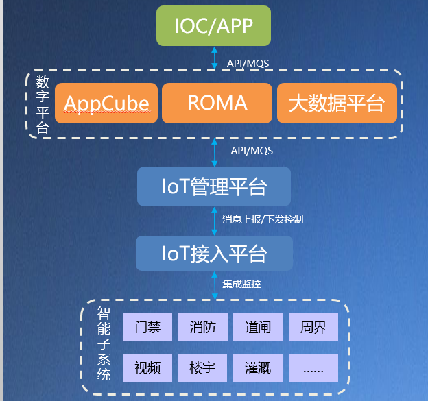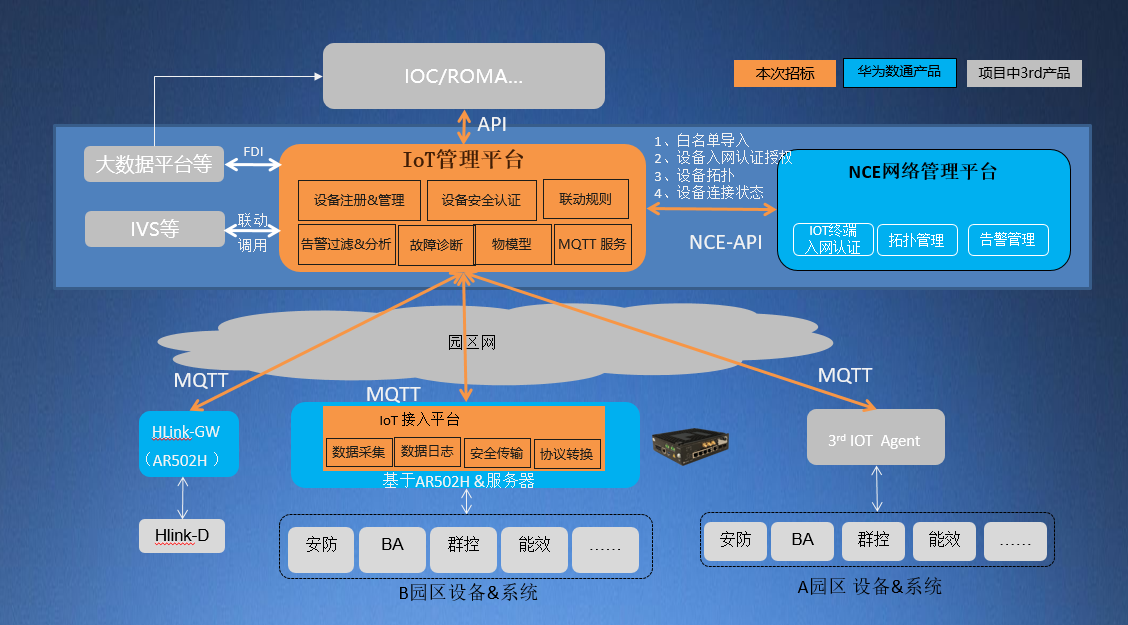 在华为园区数字平台中,敢为IoT平台是独立的IOT平台,以微服务的形式实现上下游数据支撑,主要提供传统安防、楼宇、能源等设备设施的数据采集、指令下发、日志和安全传输外,同时提供设备管理、鉴权认证、状态管理、时钟同步、故障诊断、联动规则、告警过滤和分析等功能。同时还需要支持北向开放API,将园区的安防、楼宇、能效设备以及其他传感器的数据、状态和经过分析和过滤过的告警上报。提供联动配置和规则响应,包括调用ICP通信能力,调用IVS的视频能力,支撑安防、楼宇以及园区应用的显示和控制。