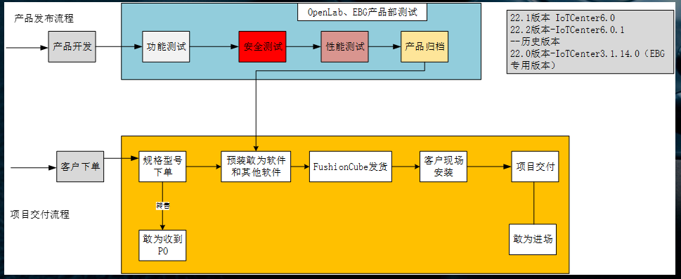 产品发布流程:在EBG产品研发发布流程中,新版本开发完成后需在华为产品部测试部门进行安全红线测试,总的测试环节包括功能测试(供应商自行承担)、安全测试、性能测试(含运维部署测试),完成这些环节后,产品部的测试接口人会将测试通过的交付件进行归档。 项目交付流程:华为侧获得客户订单后,会根据规格型号下单,同步采购部门给敢为下PO(订单),随后,华为交付侧会将预装了敢为软件和其他软件产品的组件整合成交付件,预装到FusionCube中,随后将机器发货到客户现场,之后的项目交付环节,总集、华为和联合敢为一起,完成现场交付。