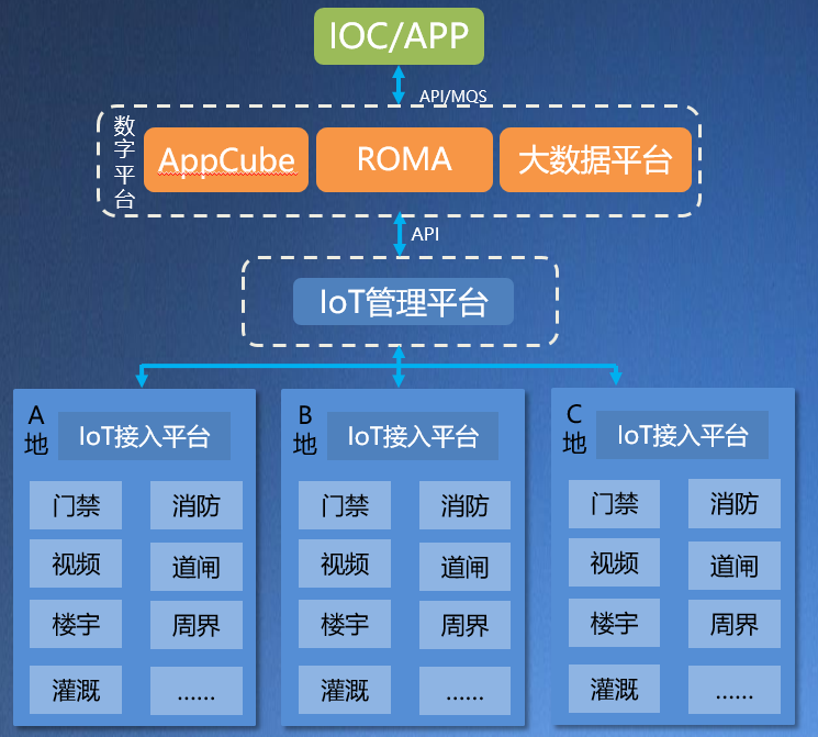 按照部署场景分为单园区集中部署场景和分布式多接入部署场景。 单园区集中部署时,IOT平台作为一个整体部署一套。提供子系统和设备的接入能力,同时提供设备管理、告警管理、数据处理与存储、北向API接口等能力,部署架构参考下图