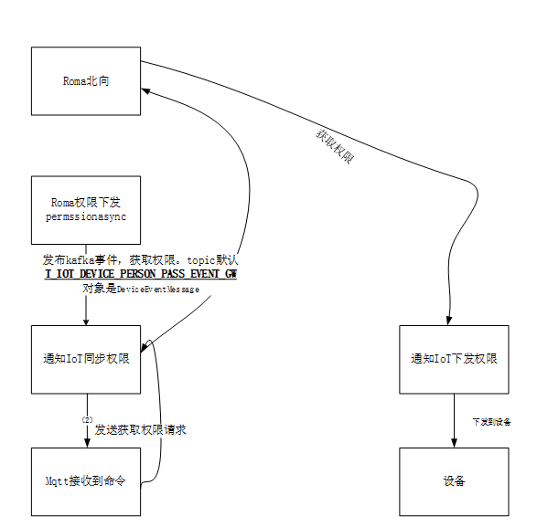 1、 权限下发到IoT平台后,无需再向南向设备发送mqtt消息,直接发布kafka消息kafka topic=T_IOT_DEVICE_PERSON_PASS_EVENT_GW, serviced=PersonPassService,eventType=applyPassVoucher, notifyType=deviceEvent)供北向应用消费。
