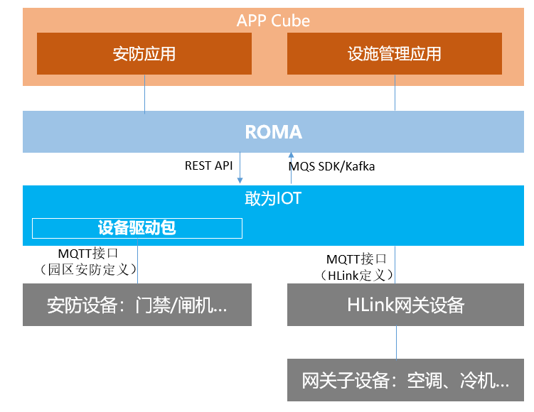 其主要实现指令下发和物联网实时数据采集。理论上敢为产品部分只对接南向设备,采集数据状态,以物模型数据的形式上报到ROMA,或将非物联网的数据,包装成物模型上报。例如,门禁人员进出事件,虽然是非物的数据结构,但也可以作为物模型属性上报。