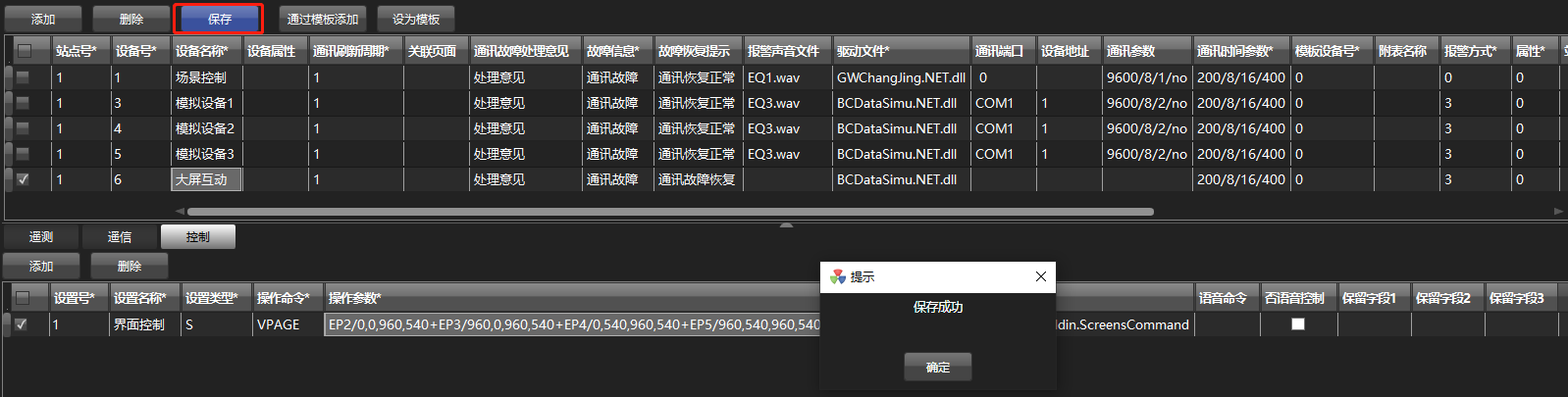 点击选中新增的“大屏互动”设备,然后点击下方的“控制”按钮,再点击“添加”按钮,新增一条记录。
