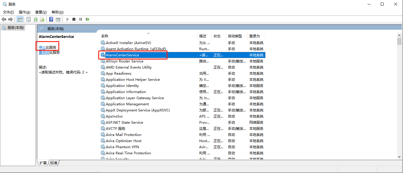 在弹出的服务界面,选中AlarmCenterService点击停止此服务如图: