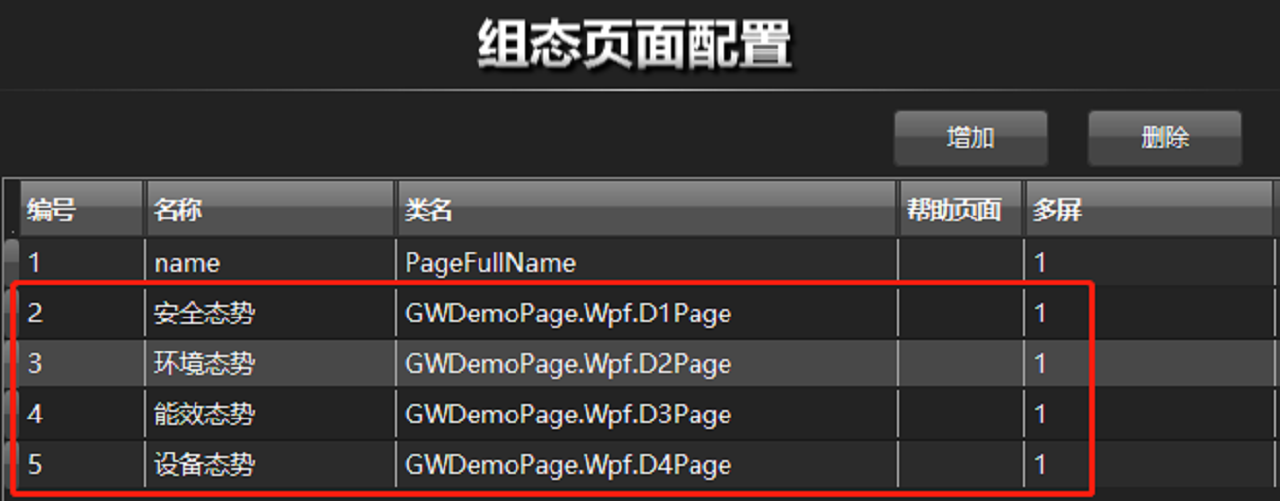 登录IoTCenter Desktop软件,点击“配置”菜单下的“组态页面配置”子菜单,将做好的组态页面配置到“GWEquipPages”表中,并记录各组态页面的Id(安全态势2,环境态势3,能效态势4,设备态势5)。