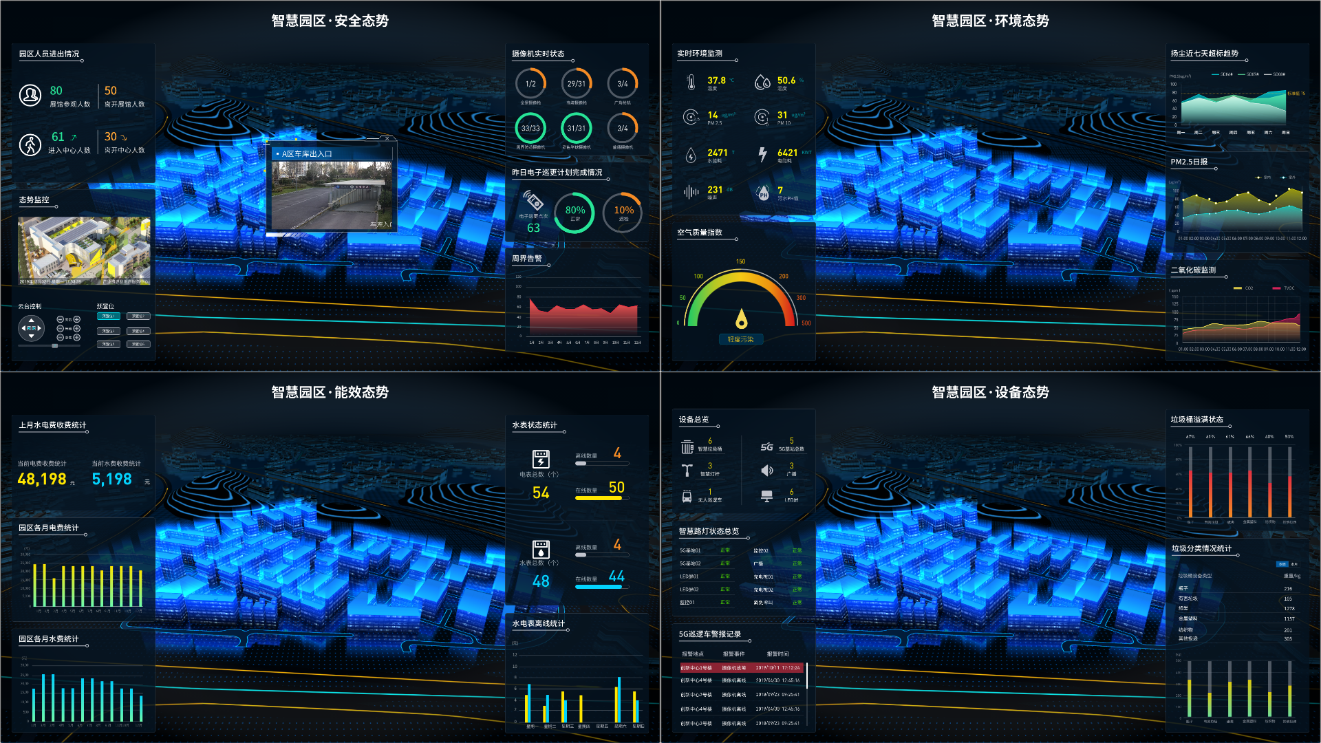 某项目中制作了 “安全态势”、“环境态势”、“能效态势”、“设备态势”四个组态页面。