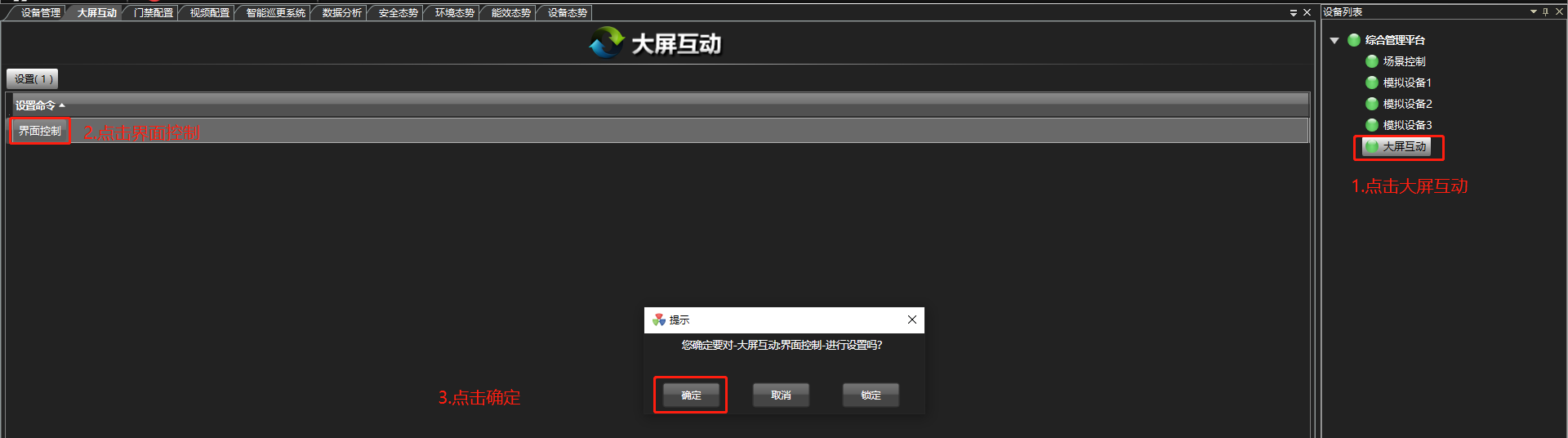 在“设备列表”中点击“大屏互动”设备,在打开的页面中点击“界面控制”按钮,既可查看大屏呈现的组态页面。