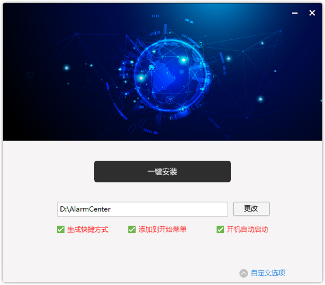 点击自定义选项,选择安装目录(默认是D盘),选择是否生成快捷方式,选择是否添加到开始菜单,选择是否开机自动启动,单击一键安装按钮即可。