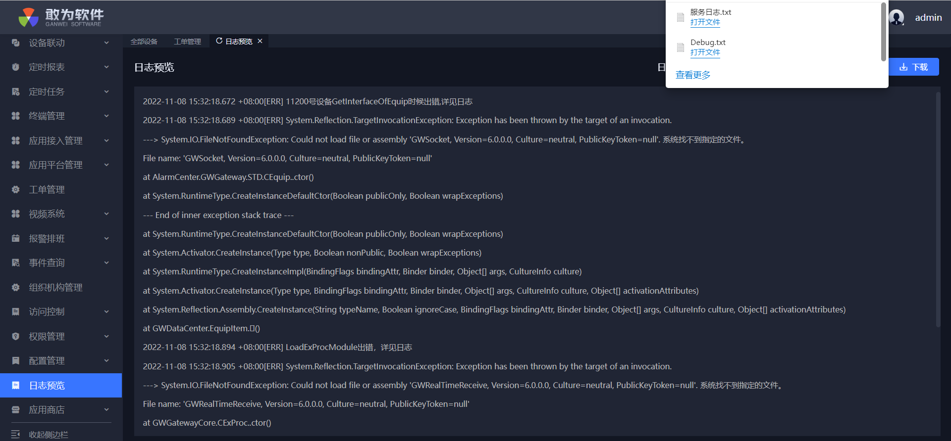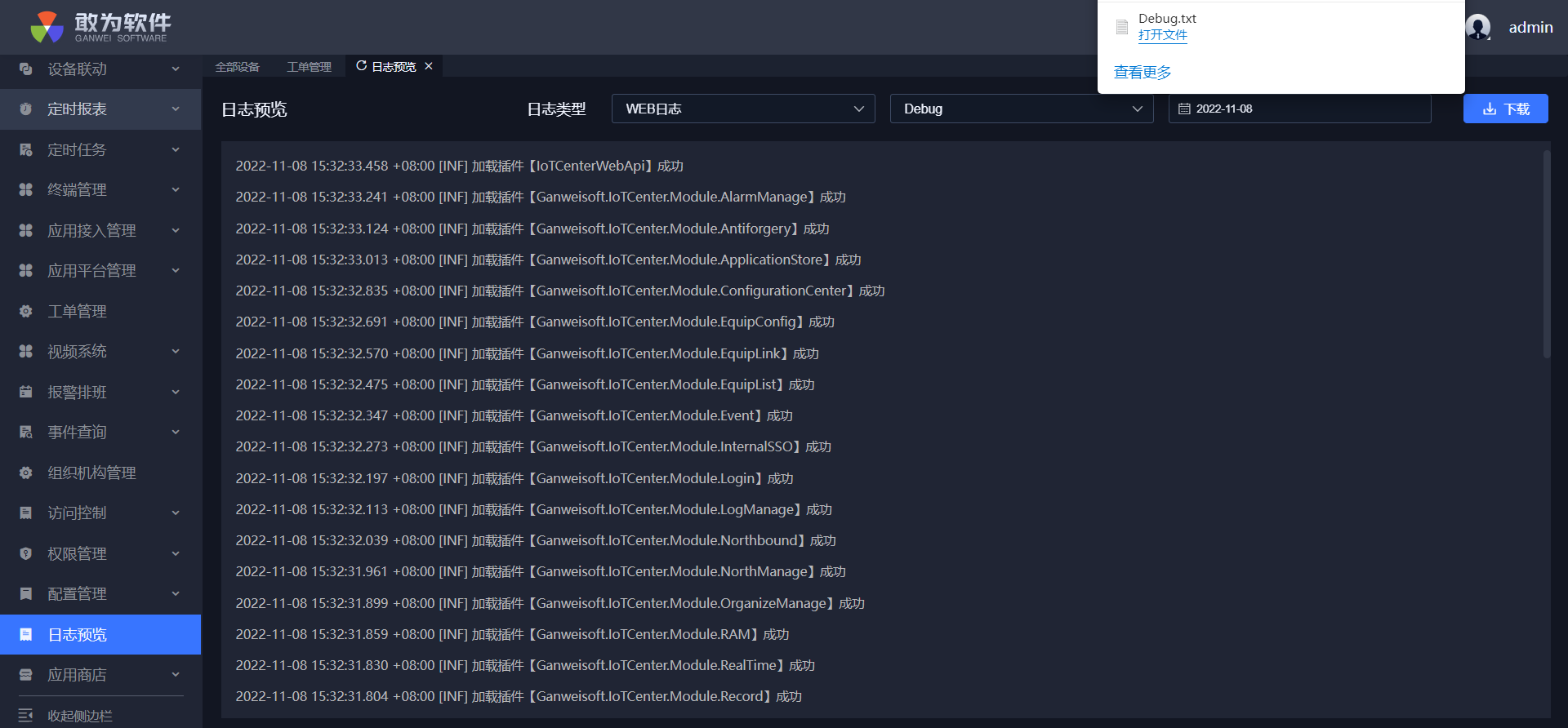 点击下载按钮。在浏览器下方会出现已导出设备的文件,服务日志文件名规则:服务日志.txt,Web日志文件规则:Web日志的类型.txt文件可打开文件查看导出的日志数据。