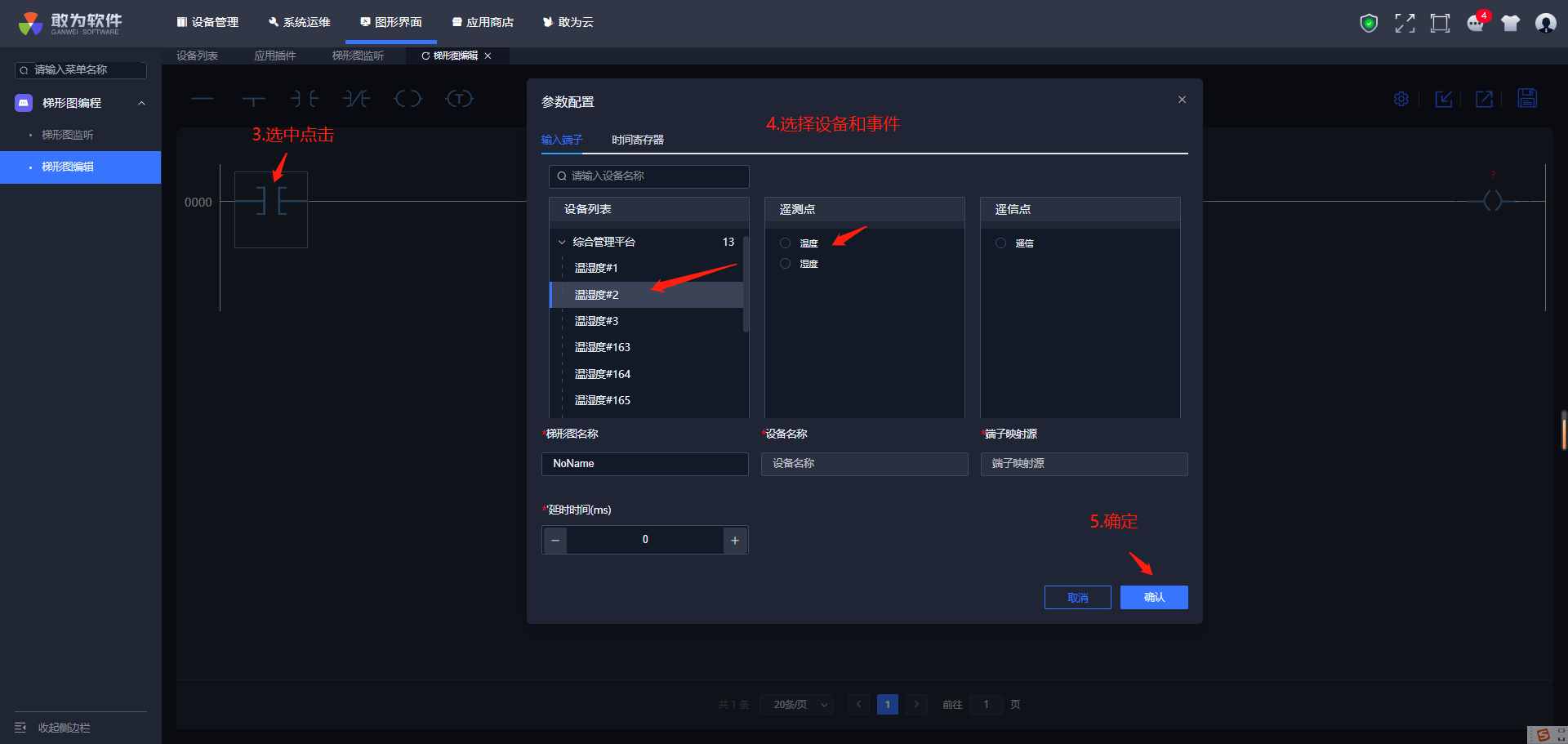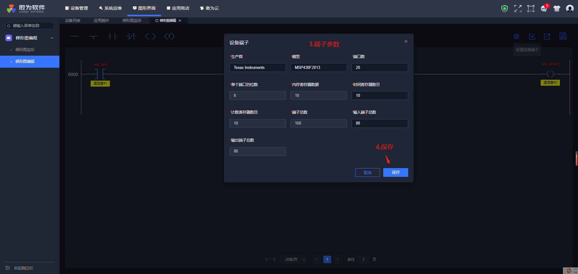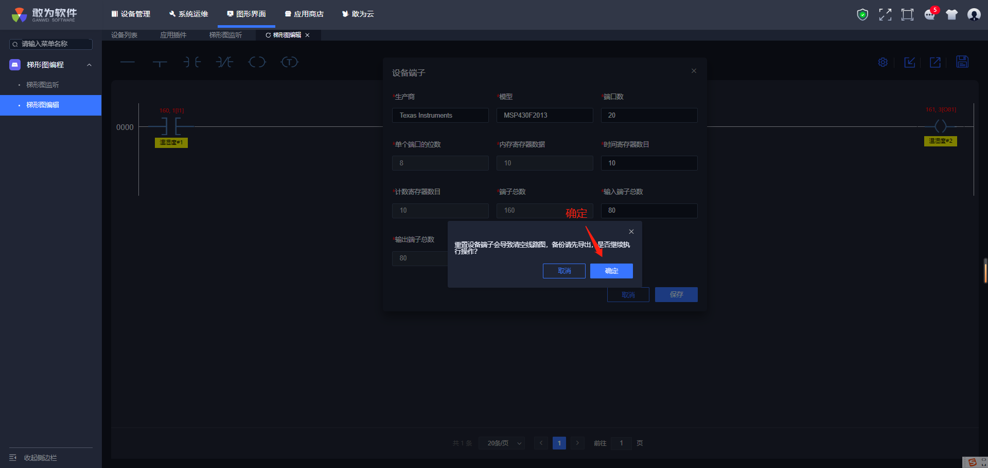- 编辑设备端子,会清空原有的梯形图。(只是暂时清除)点击保存后,才会更新最新的端子参数和最新梯形图。