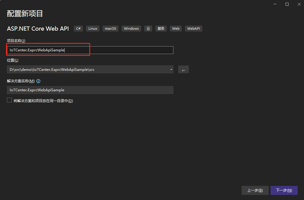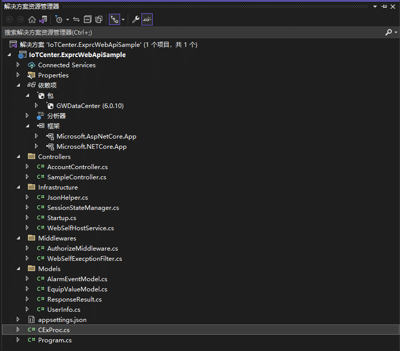 WebSelfHostService类的代码为:/// <summary> /// 创建自宿主web服务 /// </summary> public class WebSelfHostService { public async Task RunHostAsync(string hostUrl) { try { Console.Out.WriteLine("开始暴露WEBAPI"); var host = new WebHostBuilder() .UseKestrel() .UseUrls(hostUrl) .UseStartup<Startup>() .Build(); Task.WaitAll(host.RunAsync()); Console.Out.WriteLine("暴露WEBAPI成功!"); } catch (System.Exception ex) { Console.Out.WriteLine($"暴露WEBAPI异常:{ex}"); } } }SessionStateManager类的代码为:using System; using System.Collections.Generic; using System.Text; namespace IoTCenter.ExprcWebApiSample { /// <summary> /// 统一状态管理 /// </summary> public class SessionStateManager { /// <summary> /// 此处用字典来存储,真实场景下应使用 /// </summary> private Dictionary<string, string> _userTokens { get; set; } /// <summary> /// 新增token /// </summary> /// <param name="token"></param> /// <param name="userName"></param> public void Add(string token, string userName) { if (_userTokens == null) _userTokens = new Dictionary<string, string>(); if (!_userTokens.ContainsKey(token)) { _userTokens.Add(token, userName); } } /// <summary> /// 验证token是否存在 /// </summary> /// <param name="token"></param> /// <returns></returns> public bool CheckToken(string token) { return _userTokens == null ? false : _userTokens.ContainsKey(token); } /// <summary> /// 创建随机凭证 /// </summary> /// <returns></returns> public string CreateToken() { return Guid.NewGuid().ToString(); } } }JsonHelper类的代码为:using Newtonsoft.Json; using Newtonsoft.Json.Serialization; using System; using System.Collections.Generic; using System.Text; namespace IoTCenter.ExprcWebApiSample.Infrastructure { /// <summary> /// Json序列化 /// </summary> public static class JsonHelper { /// <summary> /// 提供简单的对象Json字符串反序列化对象的方法 /// </summary> /// <typeparam name="T"></typeparam> /// <param name="obj"></param>___ /// <returns></returns> public static T FromJson<T>(this string obj) where T : class { var jSetting = new JsonSerializerSettings { NullValueHandling = NullValueHandling.Ignore, TypeNameHandling = TypeNameHandling.All, ContractResolver = new CamelCasePropertyNamesContractResolver() }; if (obj != null) { return Newtonsoft.Json.JsonConvert.DeserializeObject<T>(obj); } return null; } /// <summary> /// 提供简单的对象序列化Json字符串方法 /// </summary> /// <typeparam name="T"></typeparam> /// <param name="obj"></param> /// <returns></returns> public static string ToJson<T>(this T obj) where T : class { var jSetting = new JsonSerializerSettings { NullValueHandling = NullValueHandling.Include, ContractResolver = new CamelCasePropertyNamesContractResolver() }; return Newtonsoft.Json.JsonConvert.SerializeObject(obj, jSetting); } } }创建一个源码文件夹,命名为