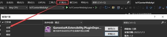 若需更新扩展,则按照如下截图点击【卸载】,当关闭Visual Studio时会自动呈现扩展卸载操作界面,待扩展卸载完成并重新安装