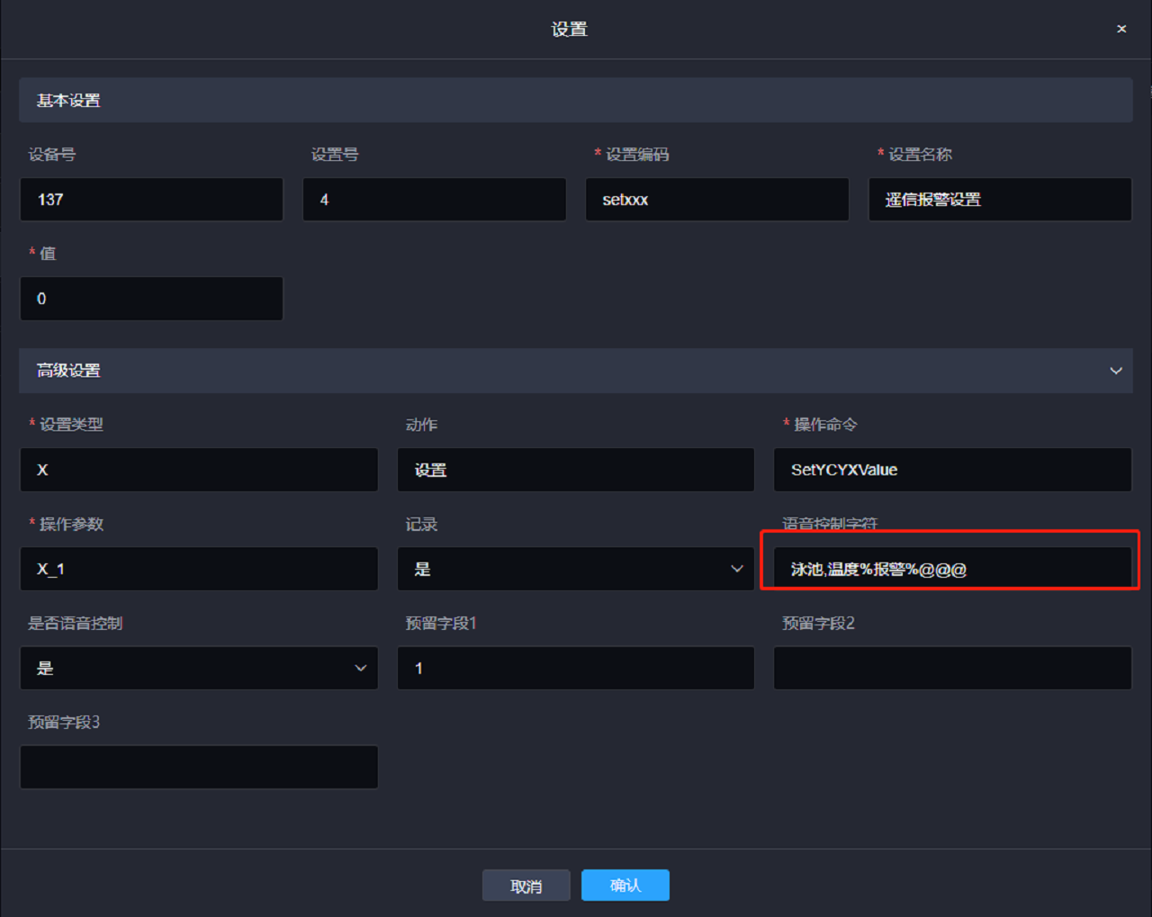 设置“温湿度#2”设备的“遥信报警设置”设置点的“语音控制字符”为“泳池,温度%报警%@@@”。