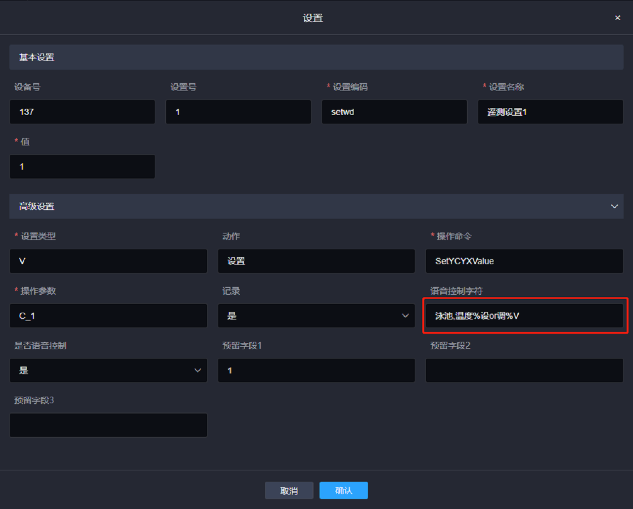 在“设备管理”菜单中修改设备“温湿度#2”的设置点“遥测设置1”,设置“是否语音控制”为“是”、设置“语音控制字符”为“泳池,温度%设or调%V”