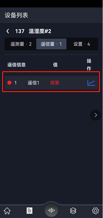 在“设备列表”中可以查看“温湿度#2”设备的“遥信1”测点状态为报警